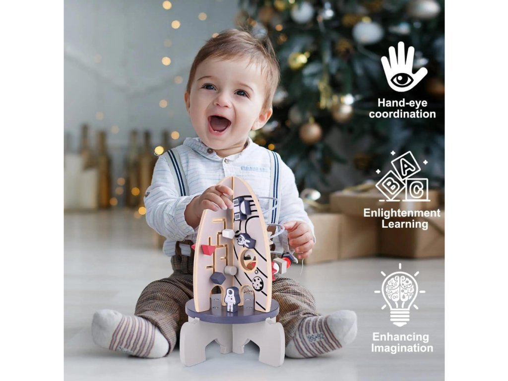 👉 Můžou posouvat barevné korálky po klikatém labyrintu, což rozvíjí jemnou motoriku a koordinaci očí a rukou.