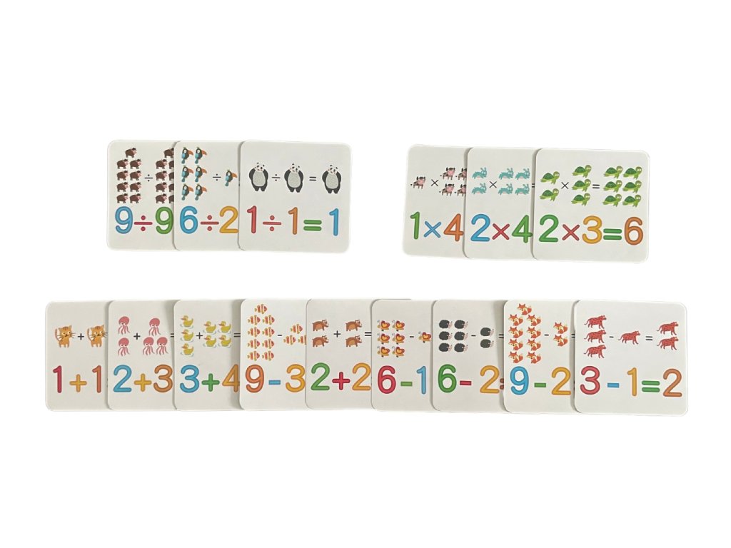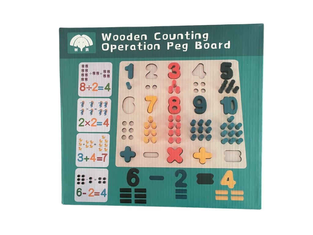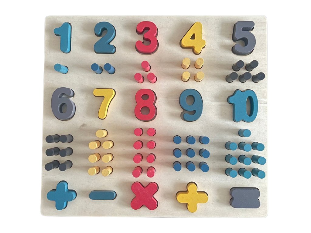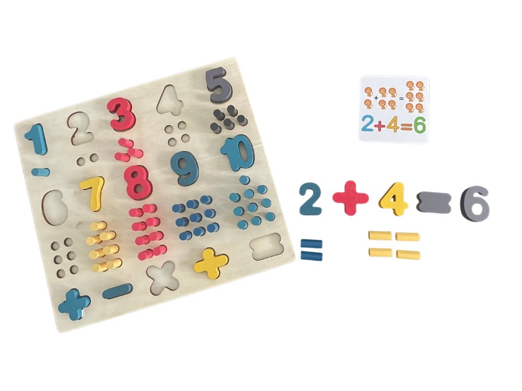 ✅ Obsah balení: dřevěná deska, čísla 1–10, matematická znaménka, kolíčky, 15 oboustranných karet s příklady
