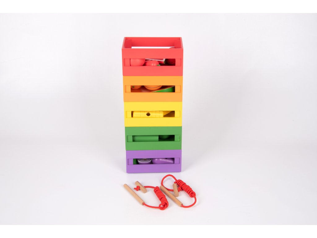 Sada obsahuje celkem 28 dílů: 5 dřevěných bedýnek, 2 šňůrky a ovoce i zeleninu včetně melounu, jahody, pomeranče, mrkve, papriky, jablka, hroznového vína a dalších. Vše je vyrobeno z FSC® certifikovaného dřeva a ručně domalováno netoxickými barvami.