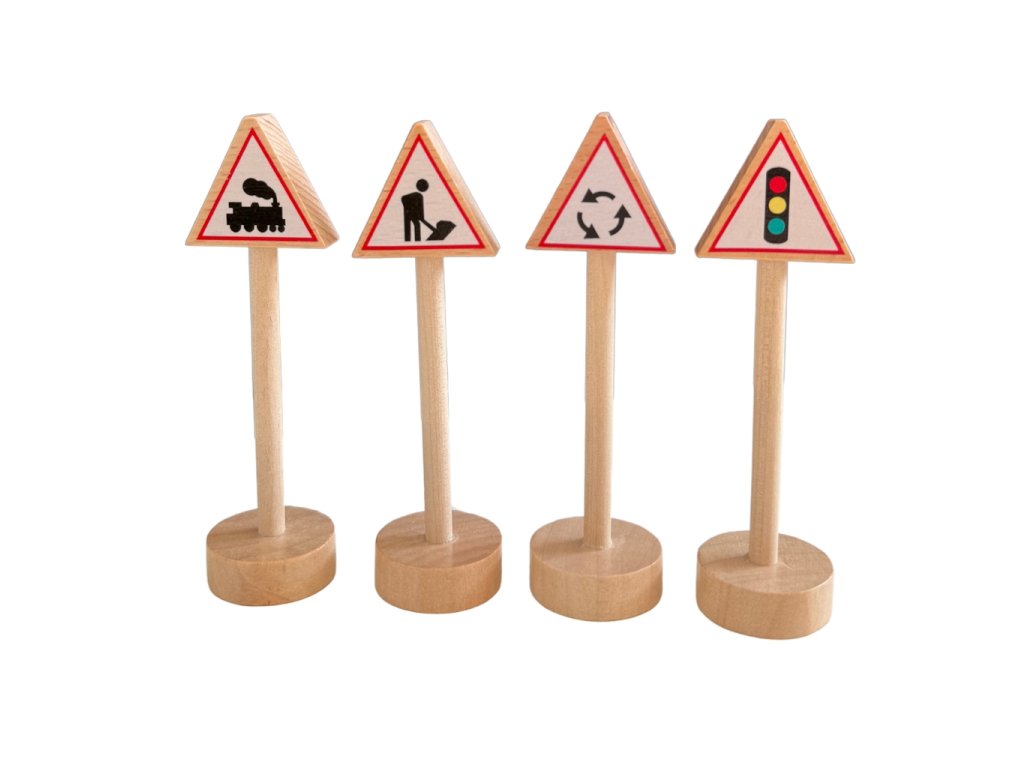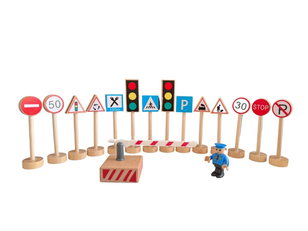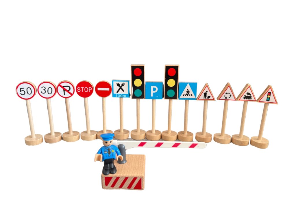✔️ 14 dřevěných značek (STOP, zákaz vjezdu, parkoviště, omezení rychlosti a další)