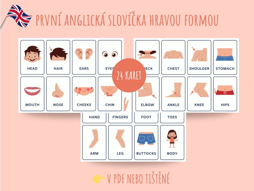 Použijte je pro společnou hru – ukaž na kartičku a pojmenuj část těla, nebo naopak – pojmenujte anglicky a nechte dítě ukázat na sobě.