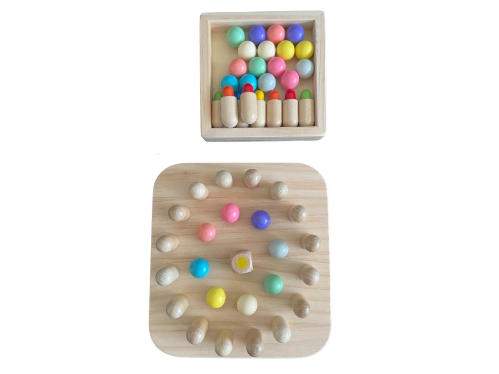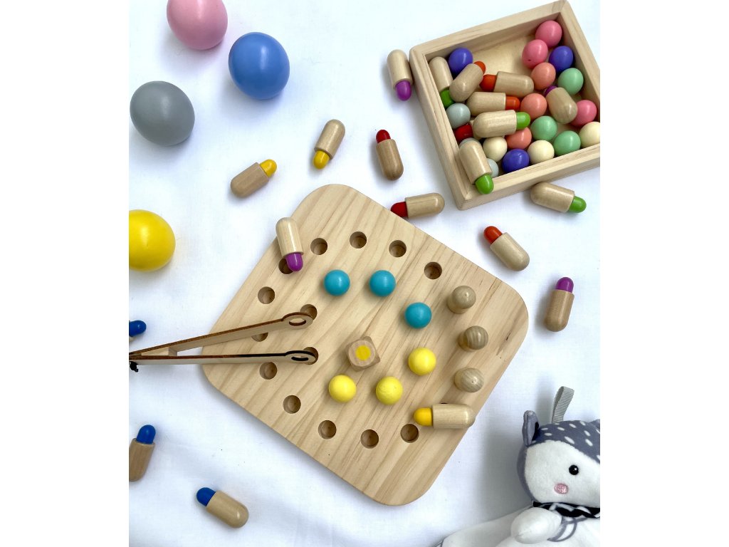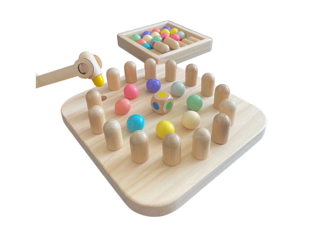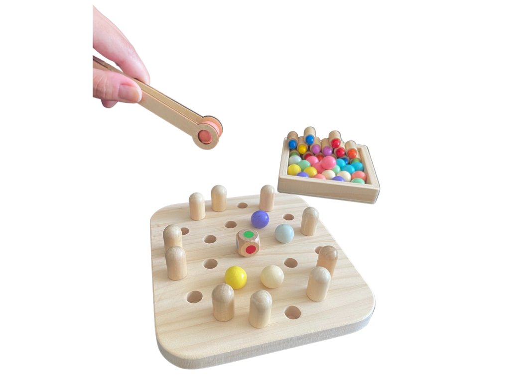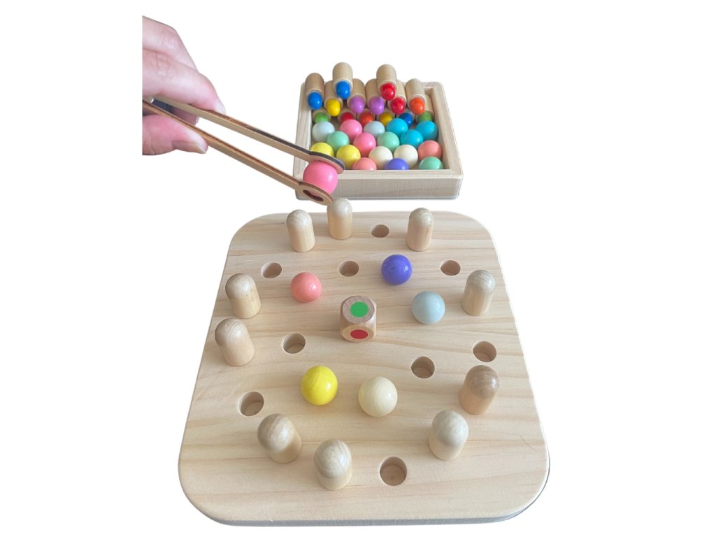 Děti hodí kostkou s barvičkami a pomocí pinzety nebo čínských hůlek uchopí kuličku či kolíček odpovídající barvy a vloží jej do otvoru na hrací desce. Jakmile je deska zaplněná, mohou hrát opačně a desku postupně vyprázdnit.