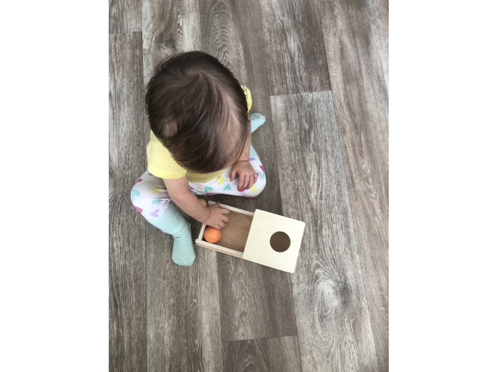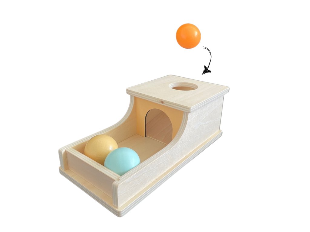 Montessori dřevěná vkládací krabička s míčkem je oblíbená vzdělávací hračka pro malé děti. 🏁 Cílem hry je vhodit kuličku do otvoru, odkud propadne do boxu a po otevření šuplíku...