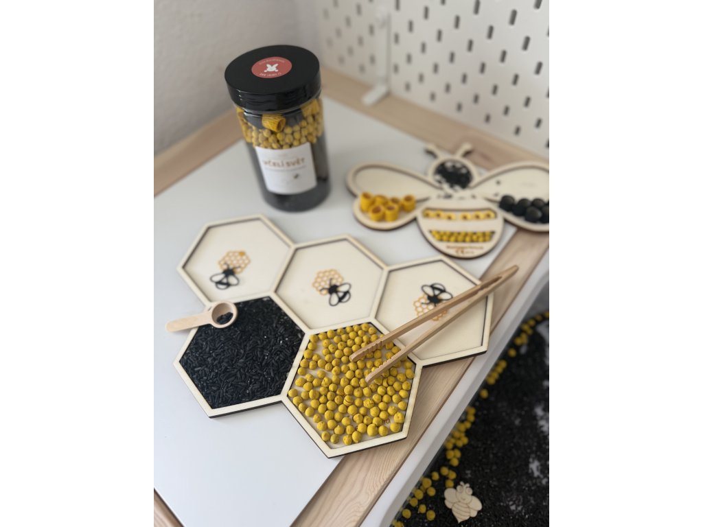 Manipulace s různými tvary a povrchy (rýže, cizrna, těstoviny) stimuluje hmat, zrak i sluch. Hra s pinzetou a lžičkou podporuje jemnou motoriku a koordinaci oko–ruka. Zároveň děti získávají povědomí o životě včel a významu přírody.
