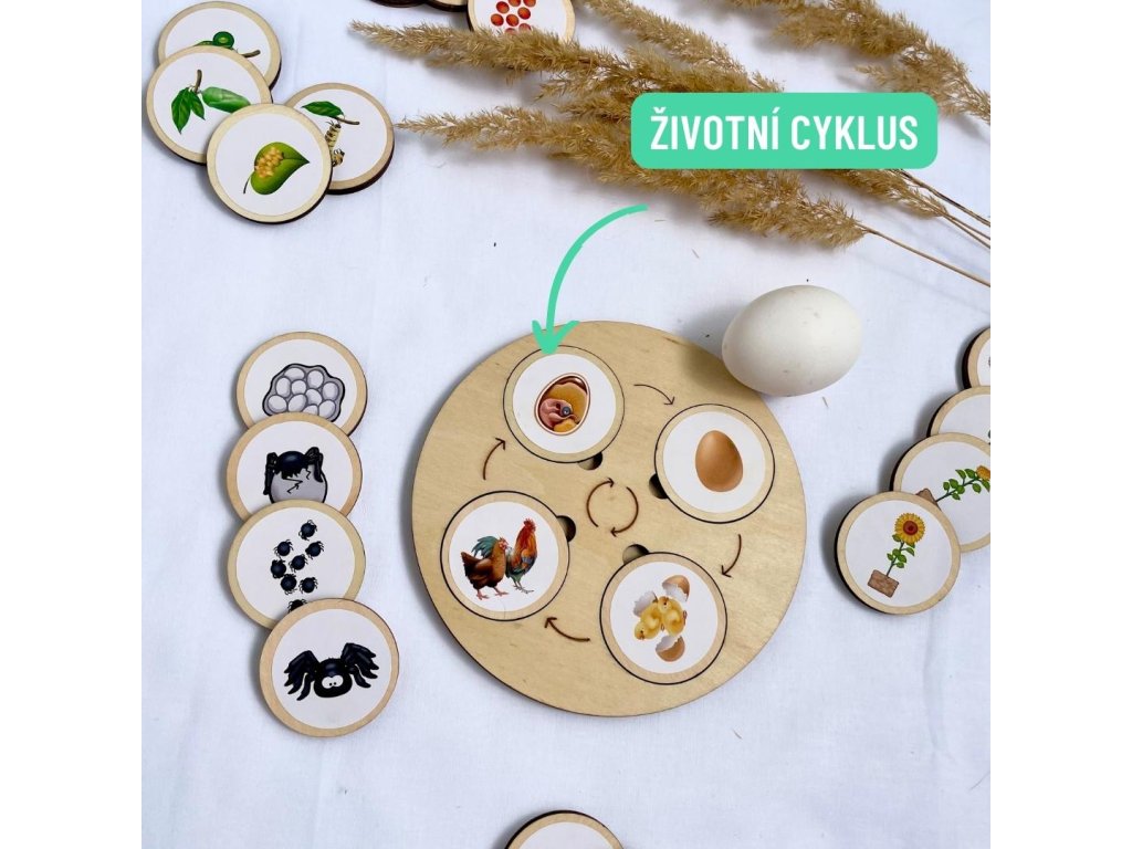 👉 Výrobek je dodávaný se štítky vývojových cyklů, které si nalepíte na jednotlivá dřevěná kolečka, která se následně nasazují do dřevěné kulaté desky.