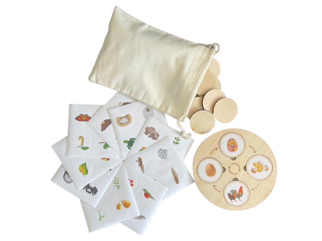 ✅ Balení obsahuje: látkový pytlíček, velké dřevěné kolo, 40 ks malých dřevěných koleček, 10 ks štítků s vývojovými cykly
